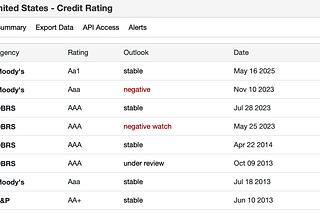 Moody’s lowers the US rating from the perfect Aaa to Aa1, May 2025 https://www.bbc.co.uk/news/articles/c4ge0xk4ld1o