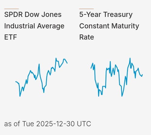 2025-12: Dow Jones Industrial Average index and 5-year US Treasury rate driving US equity