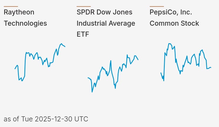 If one just searches for DIA.US, the top two computed causal predictors are Raytheon RTX in the defence sector, and DIA.US itself. The third one is Pepsi PEP as a symbol of consumer inflation.
